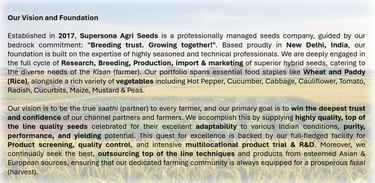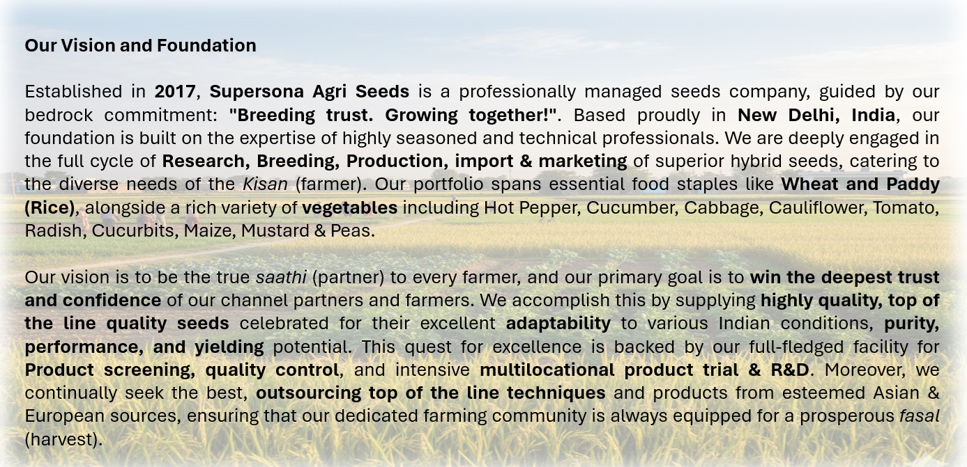 "At Supersona Agri Seeds, we believe that success begins with trust. That trust is earned not just through words, but through the consistent quality and performance of every seed we deliver. Our motto, 'Breeding trust. Growing together!', is more than a slogan; it is the unwavering commitment that drives every member of our team. My personal ambition is to establish Supersona Agri Seeds as the undisputed partner of choice for the farming community. We are singularly focused on ensuring that every farmer achieves a bountiful and profitable harvest.